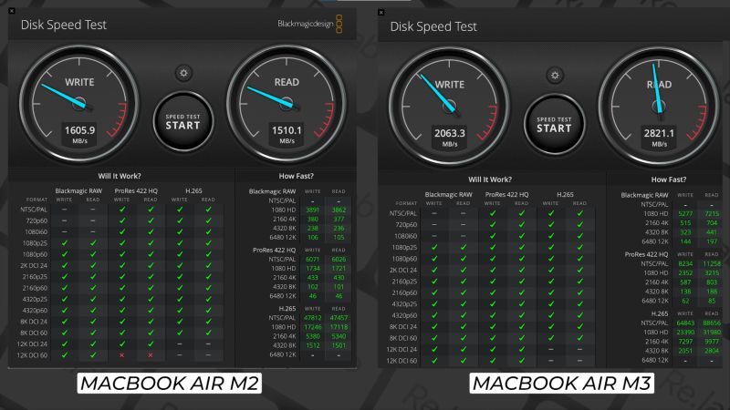 Về tốc độ đọc ghi SSD, MacBook Air M3 có tốc độ đọc/ghi SSD nhanh hơn đáng kể so với phiên bản tiền nhiệm. Mẫu Air M3 có tốc độ ghi tới 2063.3 MB/s, nhanh hơn so với MacBook Air M2 là 1605.9 MB/s. Với tốc độ đọc, MacBook Air M3 đạt tới 2821.1 MB/s trong khi MacBook Air M2 chỉ đạt 1510.1 MB/s. Nhờ tốc độ đọc/ghi nhanh hơn, MacBook Air M3 hỗ trợ rất tốt trong các công việc liên quan đồ họa.