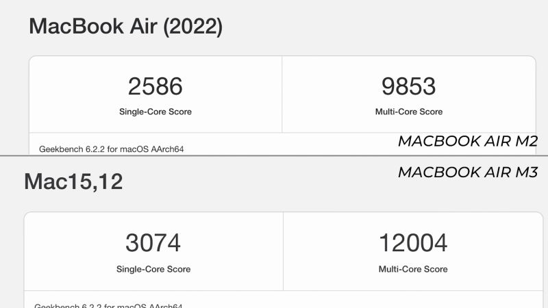 Về hiệu năng, MacBook Air M3 được trang bị con chip M3 với tiến trình 3nm so với 5nm trên MacBook Air M2. Nhờ đó, chip M3 có tốc độ xử lý dữ liệu nhanh hơn, thiết bị sẽ tiêu thụ ít năng lượng hơn và dung lượng lưu trữ cao hơn. Qua bài test trên Geekbench 6, CPU của M3 nhỉnh hơn M2 về hiệu năng đa nhân và đơn nhân khoảng 15%. Tuy nhiên, khi sử dụng hai máy với các tác vụ cơ bản như duyệt web, sử dụng nhiều tab mạng xã hội hay gõ văn bản thì gần như không có quá nhiều sự khác biệt.