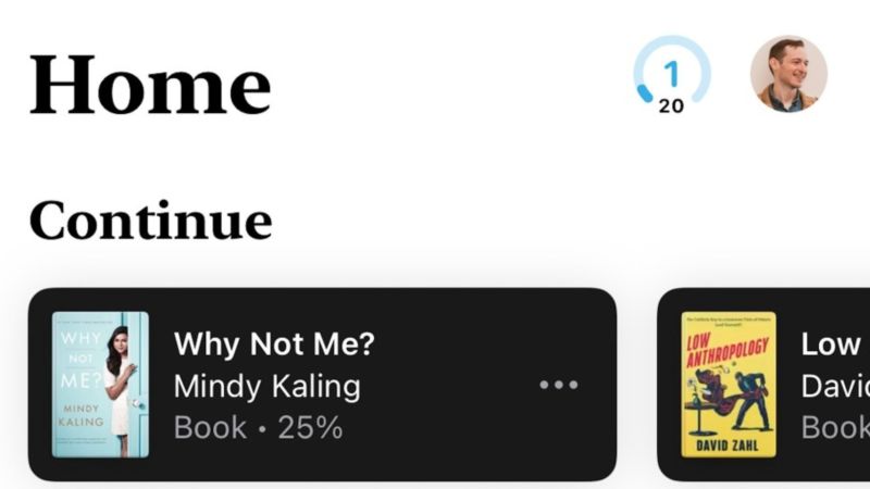 Giao diện ứng dụng “Apple Books” được tinh chỉnh: Phần nền sách trong mục “Continue” trên ứng dụng này đã được chuyển sang màu đen.
