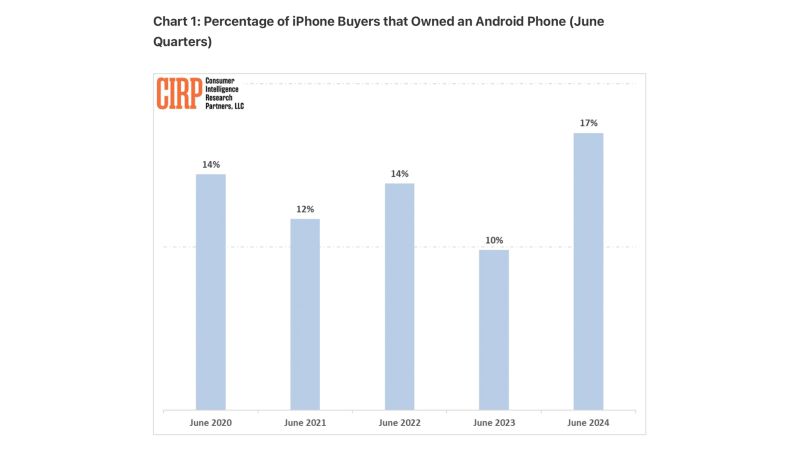 Theo dữ liệu mới của CIRP, tỷ lệ người mua iPhone mới đến từ thiết bị Android đã tăng lên mức cao nhất trong 5 năm là 17%, con số này tăng gần gấp đôi so với mức 10% vào tháng 6/2023. Báo cáo trong nghiên cứu của CIRP về hành vi mua hàng của người dùng Android chuyển sang iPhone đã chỉ ra rõ thực trạng này. Cụ thể, nghiên cứu cho thấy một phạm vi người dùng nhất định đã chuyển từ Android sang iOS, dao động trong khoảng từ 11% đến 19% từ năm 2019 đến năm 2023. Đáng chú ý là năm 2022 chứng kiến lượng người chuyển đổi cao nhất ở mức 15%.