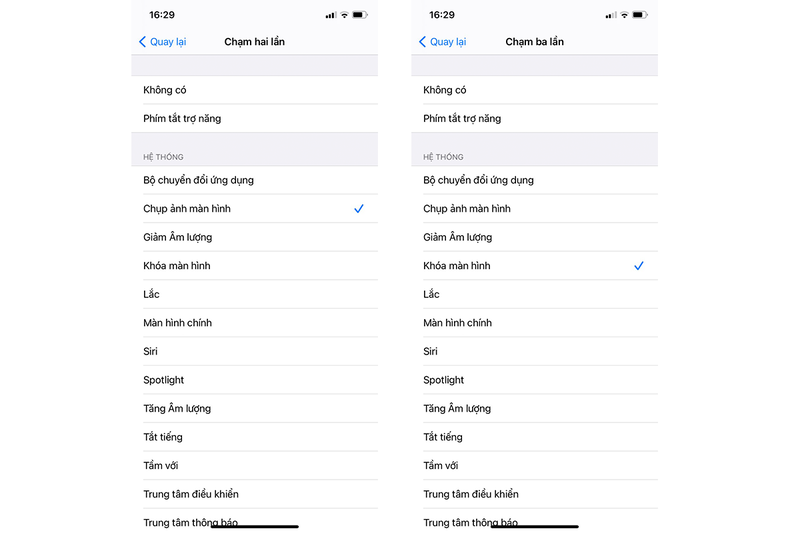 Lúc này giao diện cài đặt thao tác chạm vào mặt sau 2 lần hay 3 lần sẽ hiện ra. Bạn có thể tuỳ chọn cài đặt các chức năng theo nhu cầu sử dụng iPhone của mình: Khởi chạy Siri, Chụp ảnh màn hình, Khóa màn hình,...