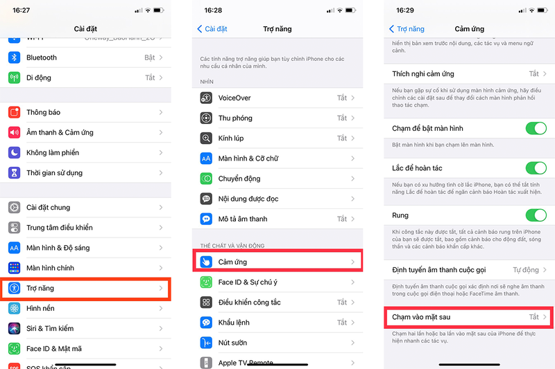 Để kích hoạt tính năng này, đầu tiên bạn vào Cài đặt ➜ Trợ năng ➜Cảm ứng ➜ Chạm vào mặt sau.