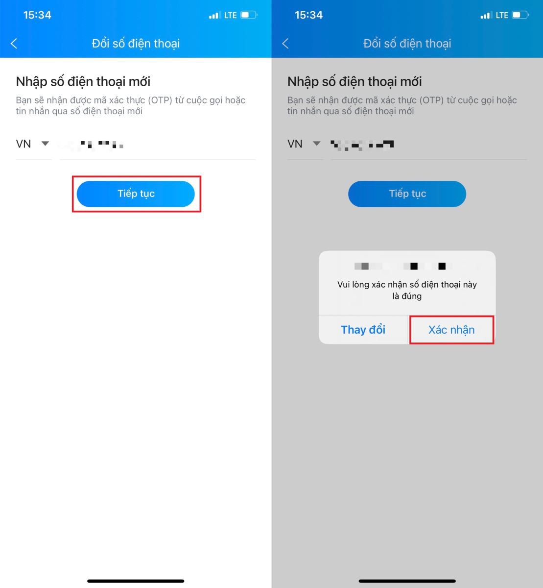 Bước 4: Nhập số điện thoại mới bạn muốn thay đổi --> Tiếp tục --> Chọn Xác nhận khi có thông báo xuất hiện