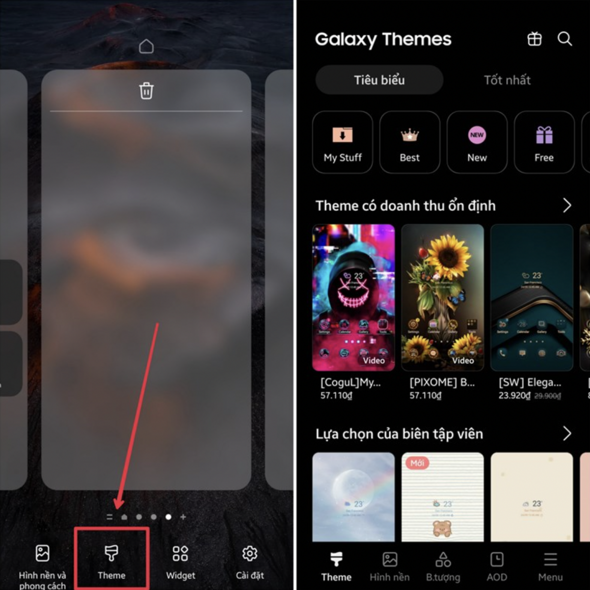 Bước 1: Nhấn giữ vào khoảng trống trên màn hình để mở Galaxy Theme --> Chọn Theme