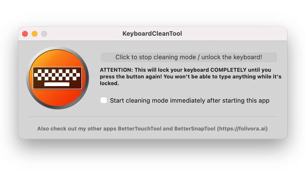 Tuy nhiên, vẫn có một cách hay hơn. Tiện ích KeyboardCleanTool miễn phí được thiết kế với mục đích này. Kích hoạt nó lên và nó sẽ khóa mọi thứ trên bàn phím của bạn ngoại trừ bàn di chuột cho đến khi bạn nhấp vào nút để mở khóa lại.