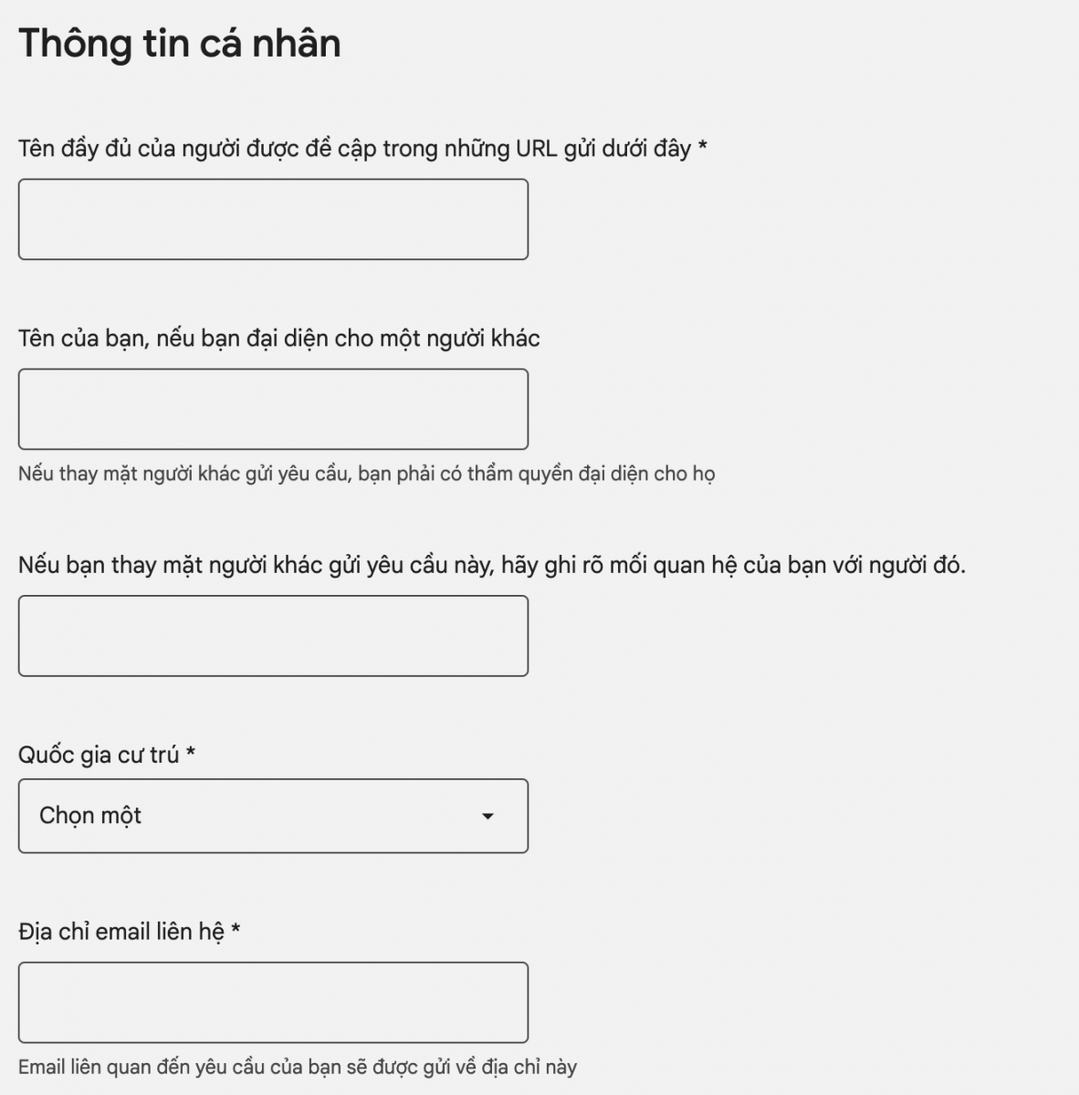 Từ đây, bạn nên điền vào biểu mẫu với thông tin tương ứng của mình, bao gồm tên đầy đủ, quốc gia cư trú, địa chỉ email liên hệ tốt nhất và danh sách các địa chỉ web chứa thông tin cá nhân của bạn.