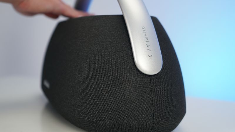 Thiết kế hình bán nguyệt đặc trưng, Harman Kardon Go + Play 3 thu hút ánh nhìn bởi sự tinh tế và sang trọng. Phần quay xách bằng thép không gỉ thách thức mọi điều kiện thời tiết với đôi chút thay đổi. Quai xách ôm bên ngoài, thiết kế mỏng dẹt tinh tế. Logo năm nay sử dụng phiên bản chiếc Onyx Studio 8 năm ngoái. Lớp ê cẳng được làm bằng 100% sợi polyeste tái chế hạn chế bụi đồng thời tăng thêm sự cuốn hút.