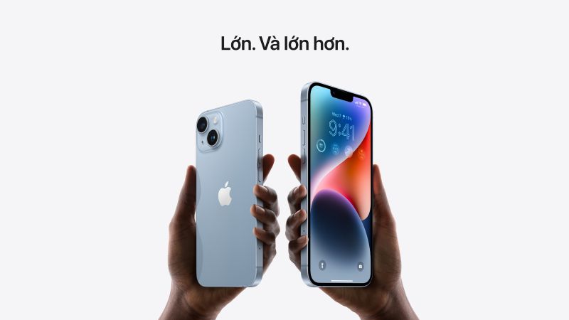 IPhone 14 vẫn giữ nguyên ngôn ngữ thiết kế của iPhone 13 với màn hình tai thỏ quen thuộc. Kích thước màn hình cũng tương đối nhỏ gọn 6.1 inch, giúp dễ dàng thao tác. Đây cũng là phiên bản nhẹ nhất trong 4 dòng iPhone mới ra mắt với 172g.