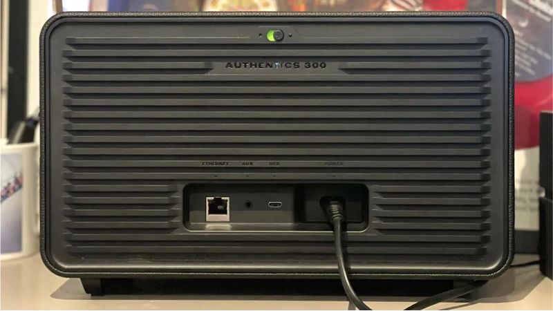 Phần quai xách bằng kim loại bọc bởi lớp vải tiện lợi và dễ dàng người dùng mang đi khắp mọi nơi. Trọng lượng Authentics 300 là 4,9kg. Kích thước 342 x 195.6 x 180.3 mm. Mặt sau của loa gồm cổng mạng LAN, giắc 3.5mm, cổng Type C và giắc nguồn.
