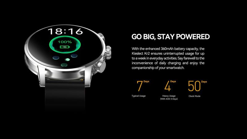 Đồng hồ thông minh KIESLECT KR2 được trang bị viên pin 360mAh cho thời gian sử dụng lên tới 7 ngày. Hơn nữa, đồng hồ này cũng chỉ mất 2 tiếng để sạc đầy pin, người dùng có thể sử dụng liên tục mà không bị gián đoạn. Ngoài việc sở hữu một viên pin lớn, đồng hồ này còn có khả năng chống nước IP68 giúp bảo vệ tối đa đồng hồ khỏi những sự cố xảy ra với nước như mồ hôi, mưa nhẹ, nước bắn,...