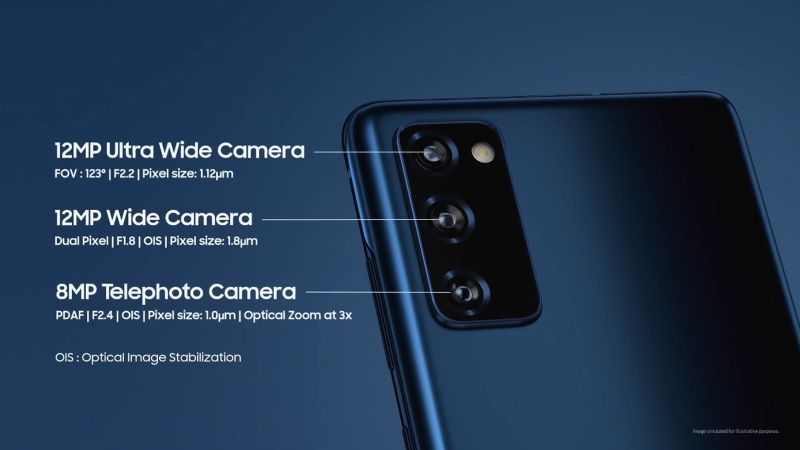 Galaxy S20 FE thừa hưởng cụm camera từ người đàn anh Samsung Galaxy S20 với cụm 3 camera với camera chính 12MP hỗ trợ quay phim lên đến 8K kèm khả năng chống rung quang OIS kết hợp với chống rung điện tử EIS.