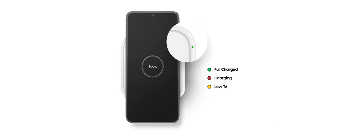 Bên cạnh đó, điểm giúp Đế sạc đơn không dây Samsung 15W EP-P2400 ghi điểm trong mắt người dùng công nghệ đó là thiết kế đèn LED trực quan giúp người dùng thuận tiện hơn trong quá trình sạc thiết bị di động. Cụ thể, màu đỏ khi sạc, màu đỏ nhấp nháy khi lỗi sạc như sạc chưa vào hay thiết bị đang để lệch,.. và màu xanh lá cây khi đã sạc đầy pin. Khi đến giờ đi ngủ, bạn có thể giảm độ sáng để không làm phiền giấc ngủ của mình.
