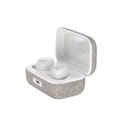 Hộp sạc của Sennheiser Momentum True Wireless 3 được bọc một lớp vải dệt vô cùng cuốn hút. Kích thước nhỏ hơn một chút so với phiên bản tiền nhiệm, giúp người dùng dễ dàng cầm nắm và bỏ túi. Phía trước hộp sạc được tích hợp cổng USB Type-C và đèn báo tình trạng pin. Phiên bản năm nay được mang đến 3 màu sắc cực trẻ trung và tinh tế gồm đen, trắng và xám graphite.