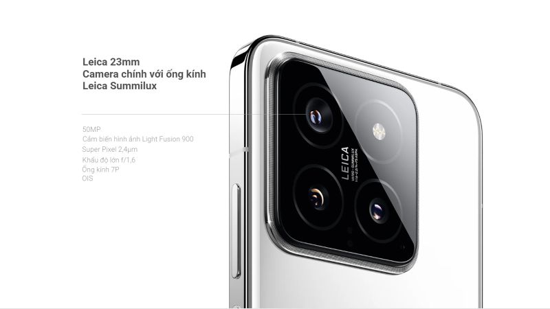 Hệ thống camera chính là điểm nhấn nổi bật trên Xiaomi 14 khi máy được trang bị ống kính Leica thế hệ mới, đánh dấu sự hợp tác tiếp tục giữa Xiaomi và Leica. Ống kính chính sử dụng cảm biến Leica Summilux với khẩu độ lớn ƒ/1.6, mang đến khả năng lấy nét tốt, thu sáng hiệu quả ngay cả trong điều kiện thiếu sáng hay khi chụp ngược sáng. Nhờ vậy, ảnh chụp luôn sắc nét, sống động với màu sắc chân thực, độ tương phản cao và độ phân giải ấn tượng.